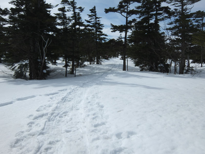 非常用装備を持ちスキー靴のまま頂上まで行けそうだ(推奨はできない)。