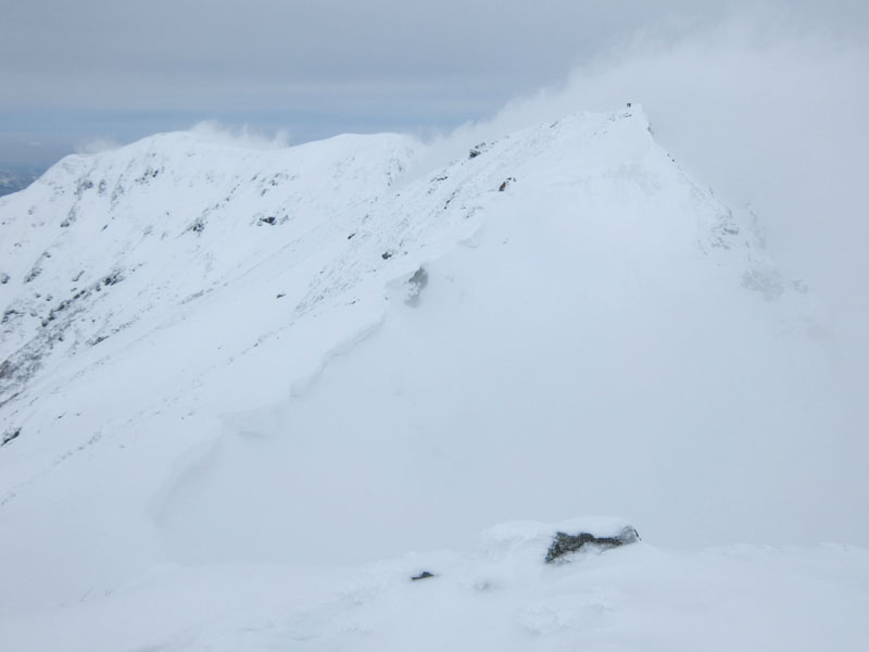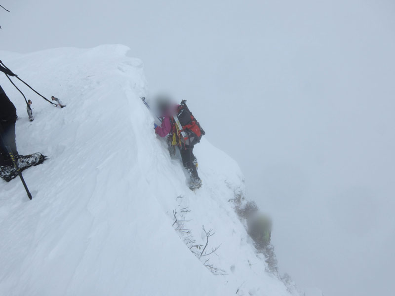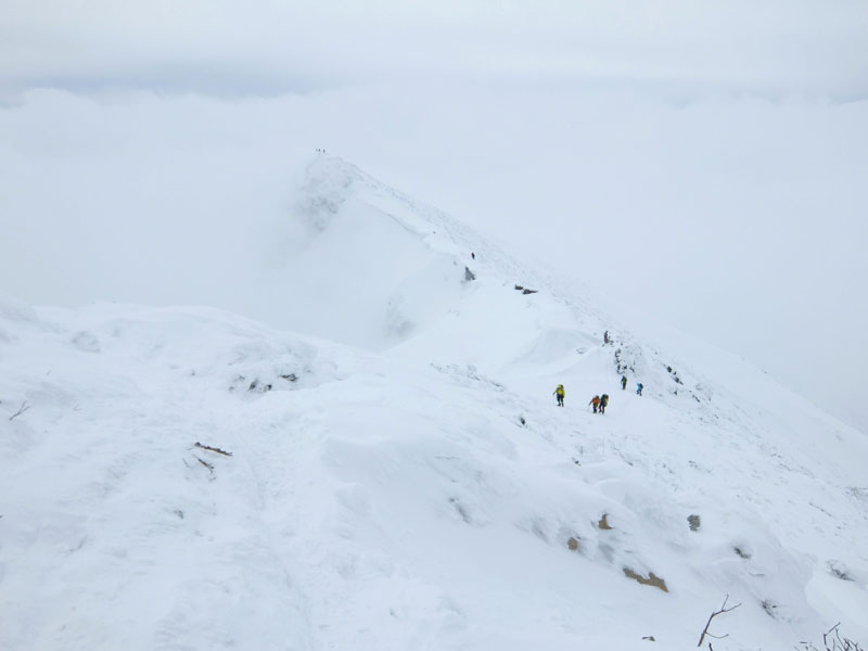 最後は雪庇が薄くなっている部分を狙って稜線に突き上げるが、