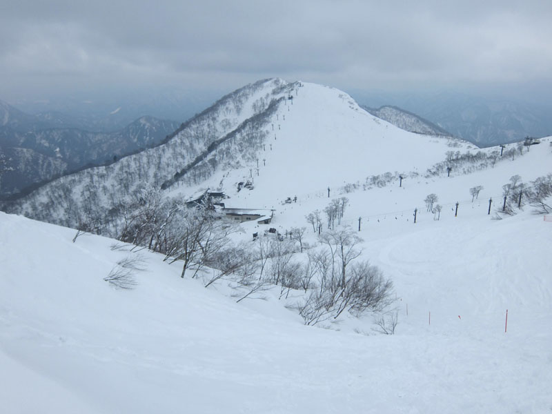 肩の小屋の奥には、苗場山とかぐらスキー場が見えている。