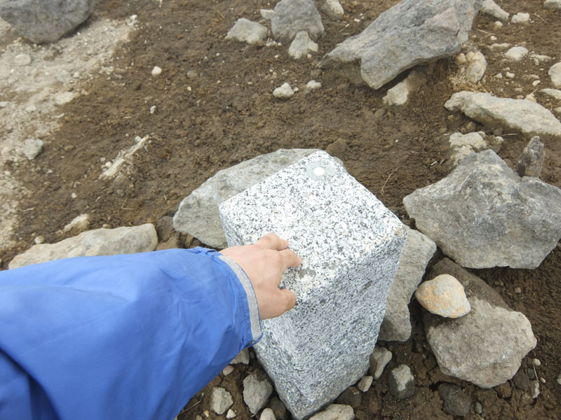 斜面上部からサッカーボール大の落石が激しく飛び跳ねながら、
