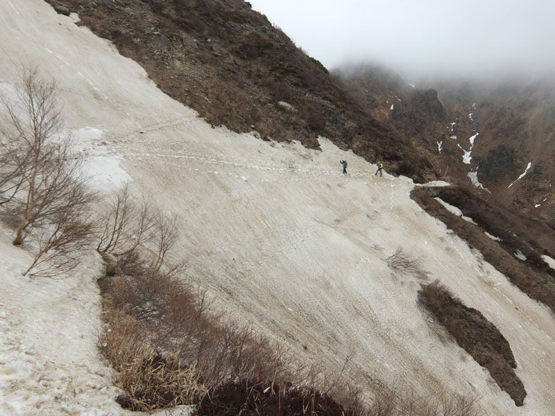 特に危険なのが剣ヶ峰の東面にある2ヶ所の雪渓の横断で、