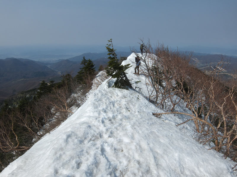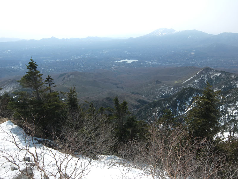 根子岳の奥には長野市街地や北陸新幹線の高架橋が見える。