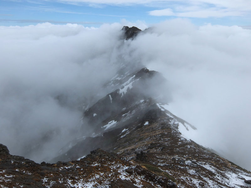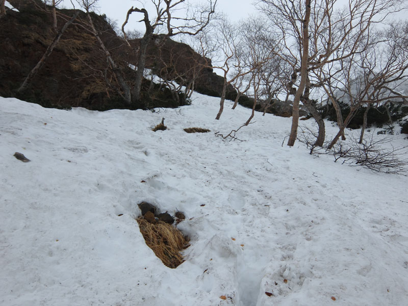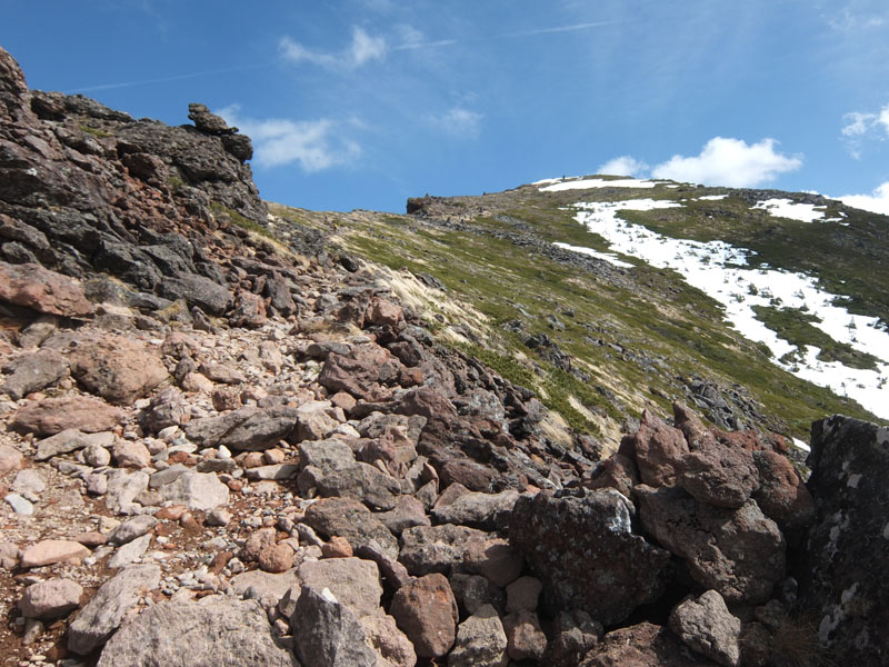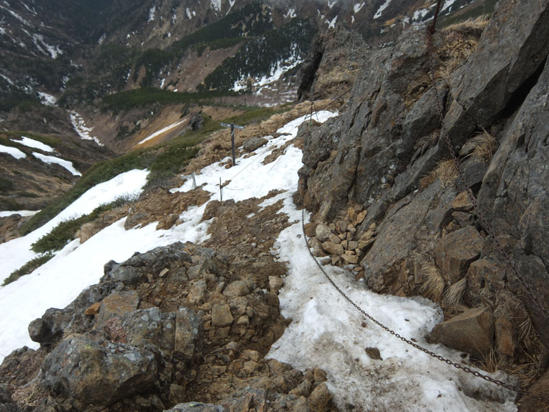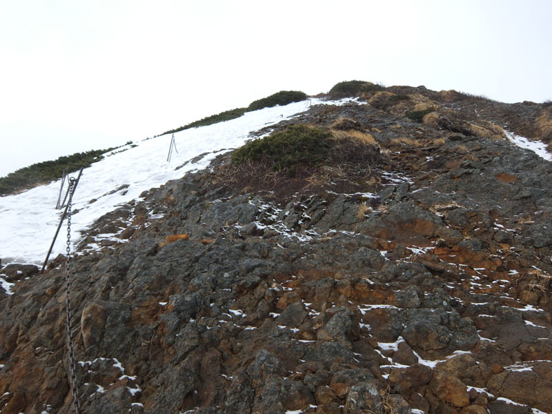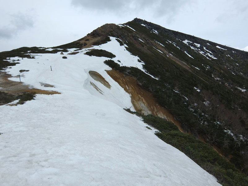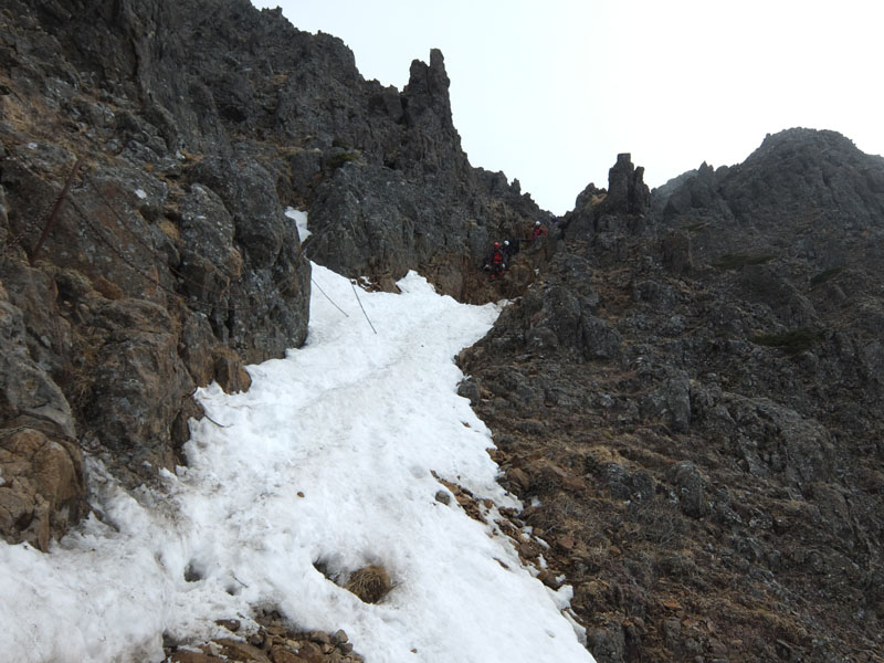 結構急傾斜の残雪があり、ナイフリッジにも残雪があり危ない。