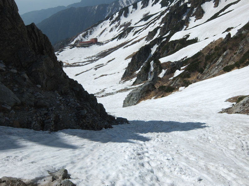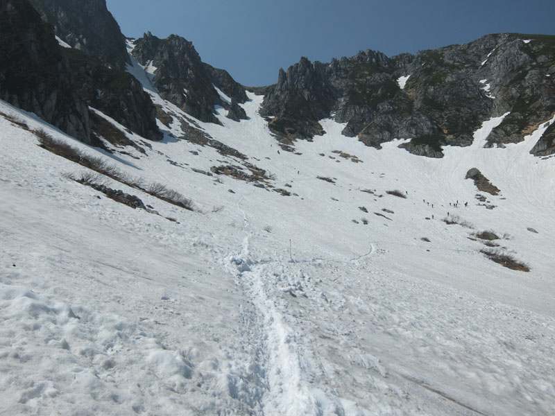最初は急傾斜でなかなか怖いが、トレースがバケツ状になっており、