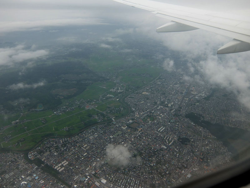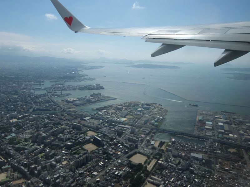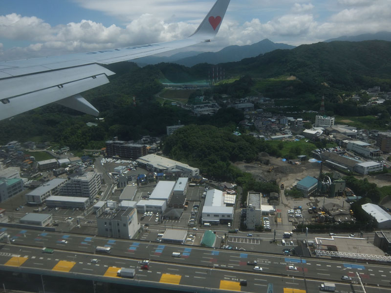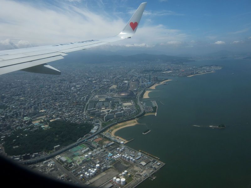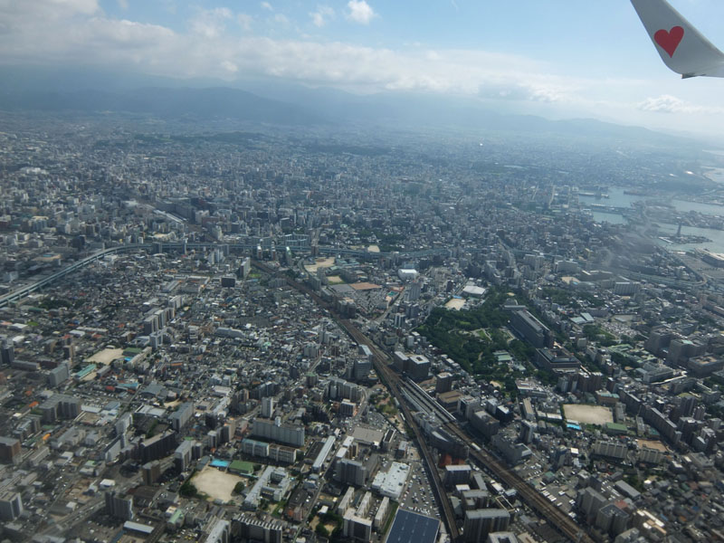 福岡の市街地を低空飛行して福岡空港へ。