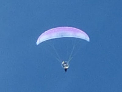 山頂を越えてモーターパラグライダーが飛んでいる。