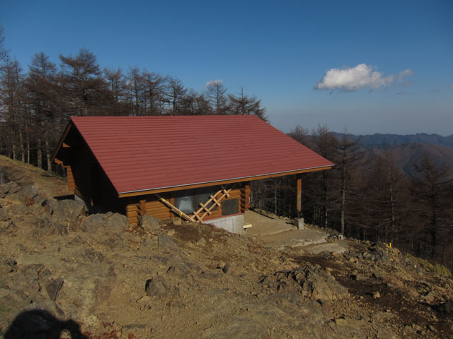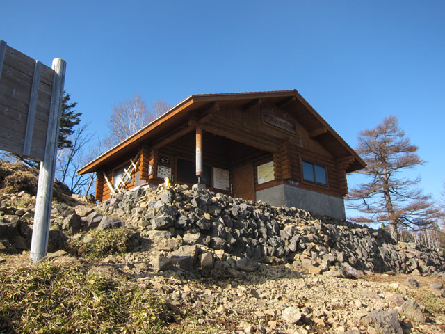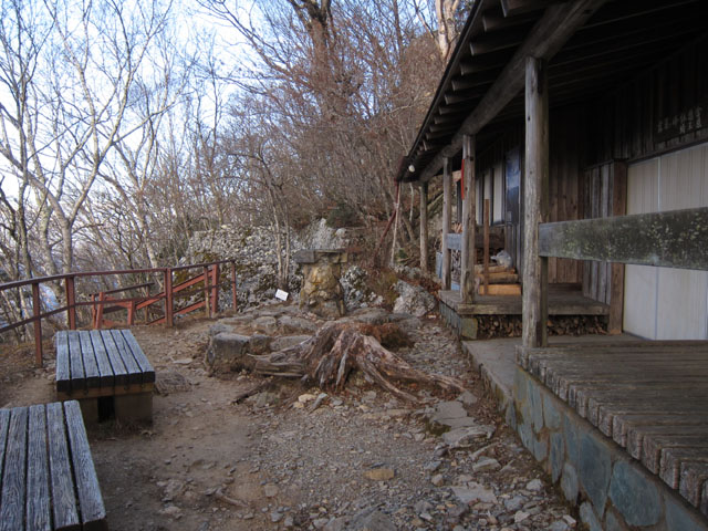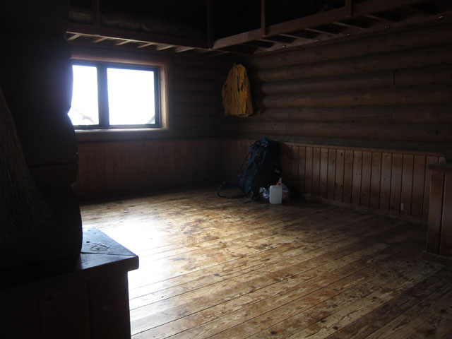 避難小屋の壁には謎の梯子のようなものがかかっている。