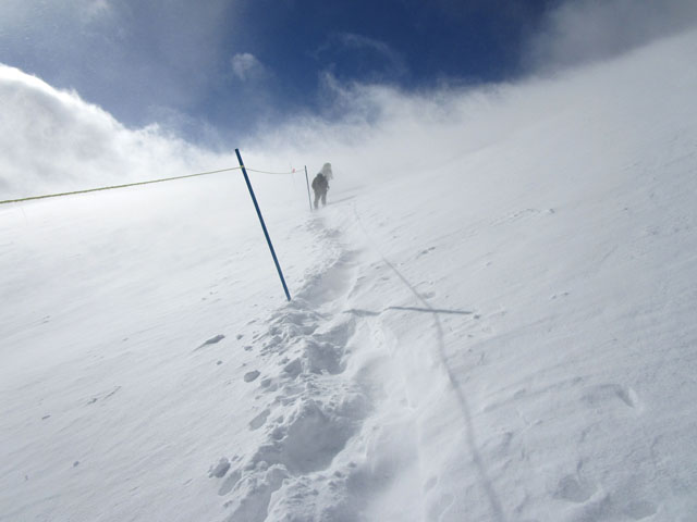 風が強い。地吹雪でトレースが瞬く間に消える。