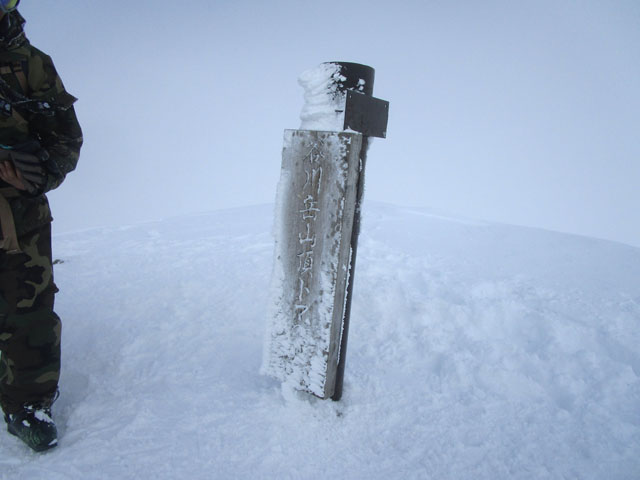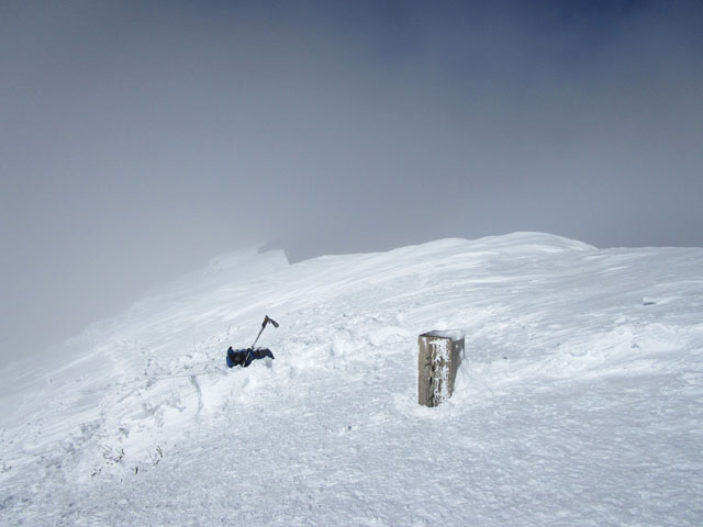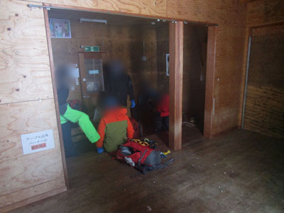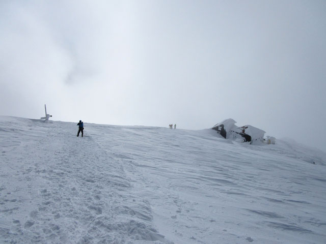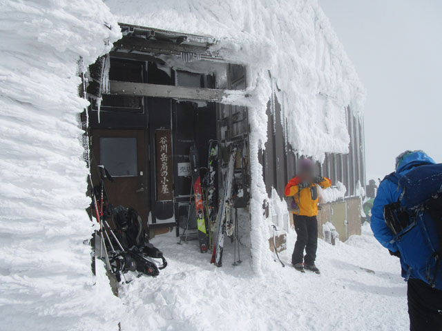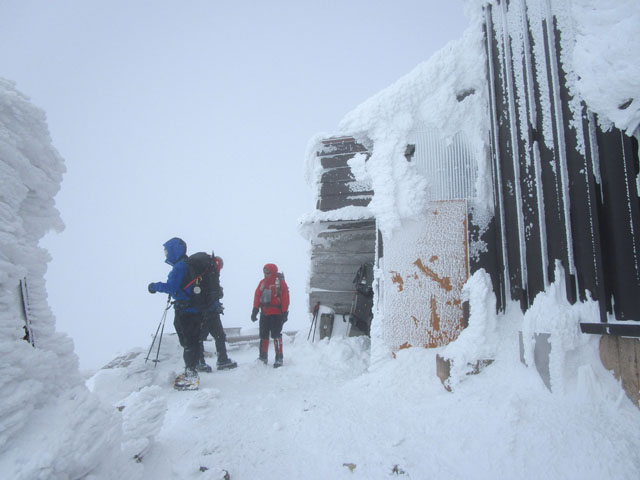 地吹雪に負けずに登り肩の小屋に駆け込む。