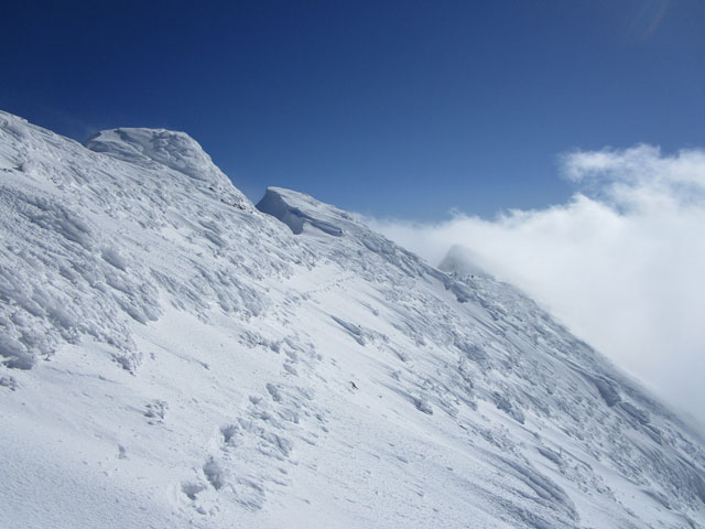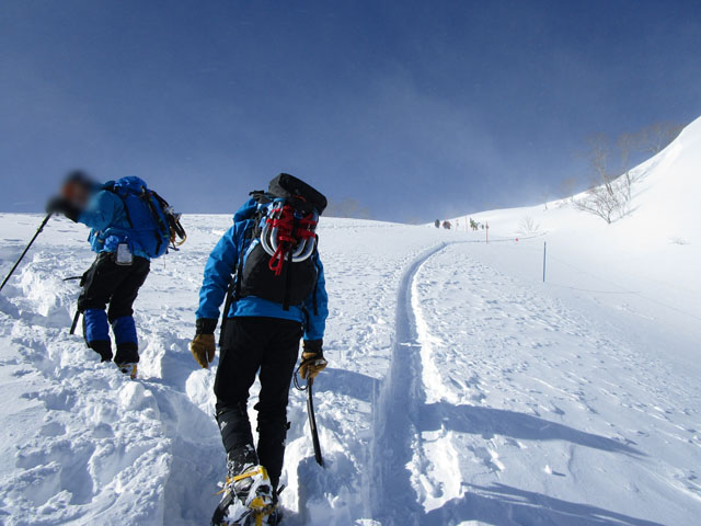 風が強い。地吹雪でトレースが瞬く間に消える。