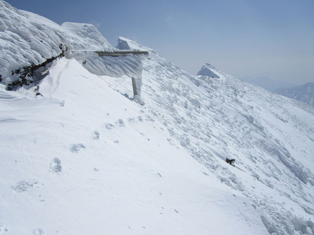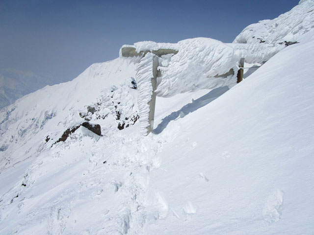 雪庇には近寄らないのが基本で、不用意にトレースを外してはならない。