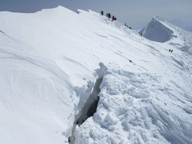 雪庇と断崖絶壁の間に深いクラックが成長するため、