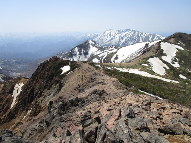 雪渓を横断し、その後の岩場をクリアすると朝日岳の肩まで登る。