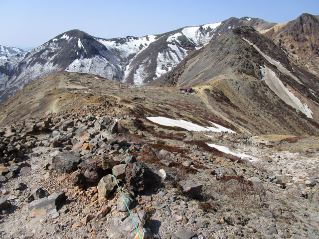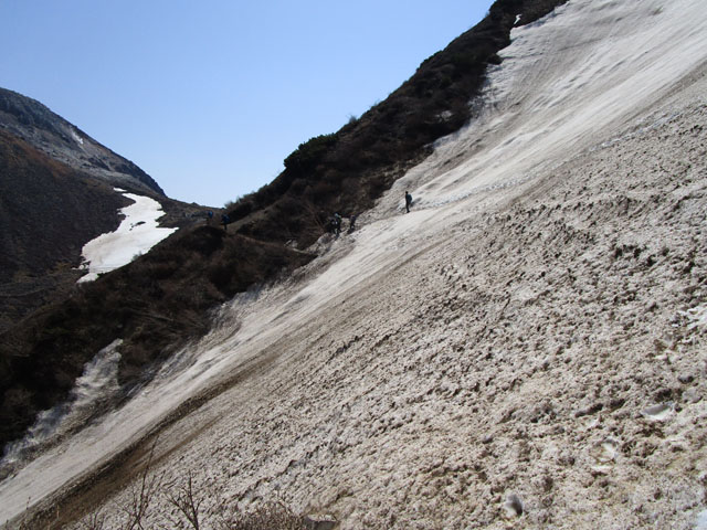 写真右に見えている剣ヶ峰トラバース路の雪渓横断が怖い。