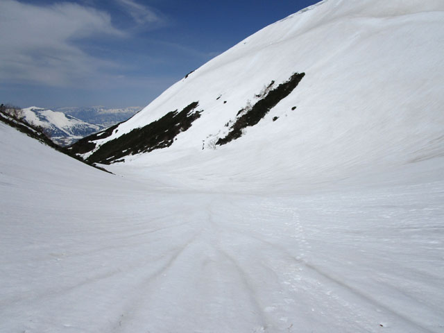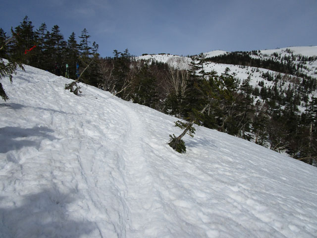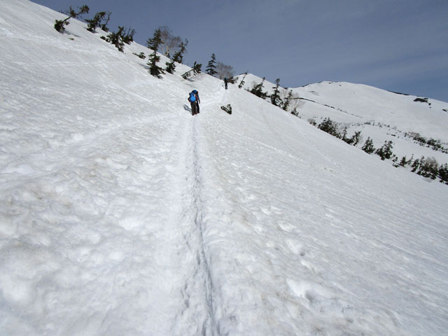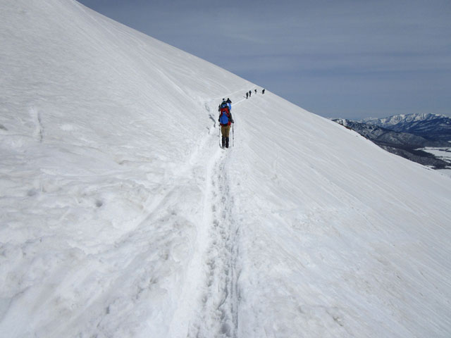 念のため頂上側からの雪崩や雪庇崩落に注意。