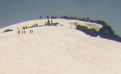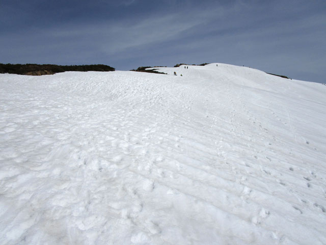 さて、頂上で見ていたところ、雪壁を通過できず、