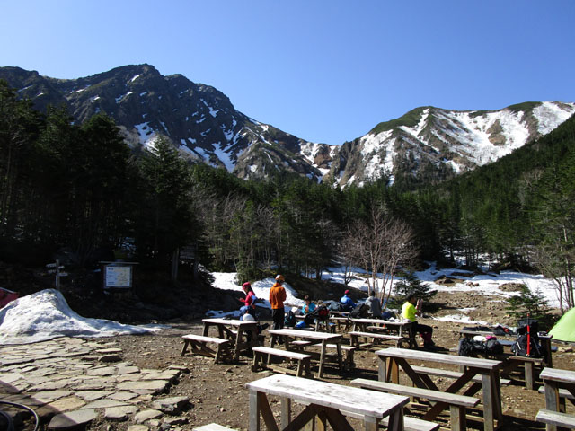 森林限界以下からは雪がある。軽アイゼンでOK。