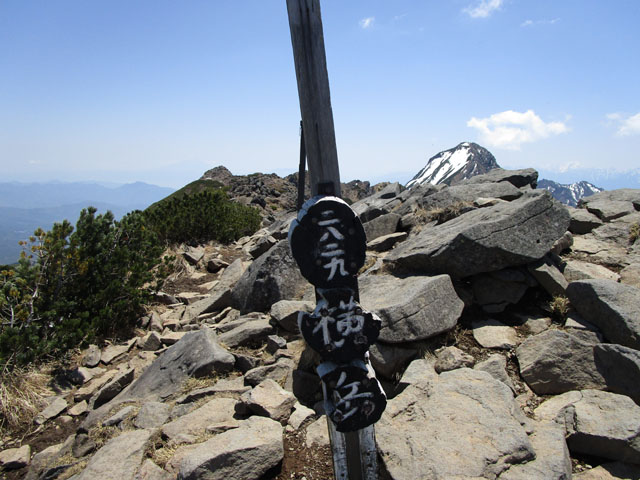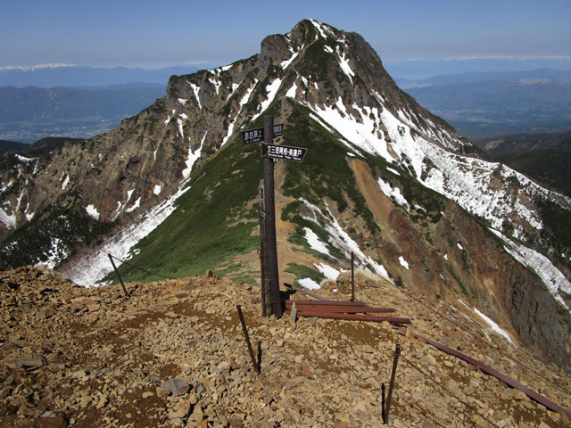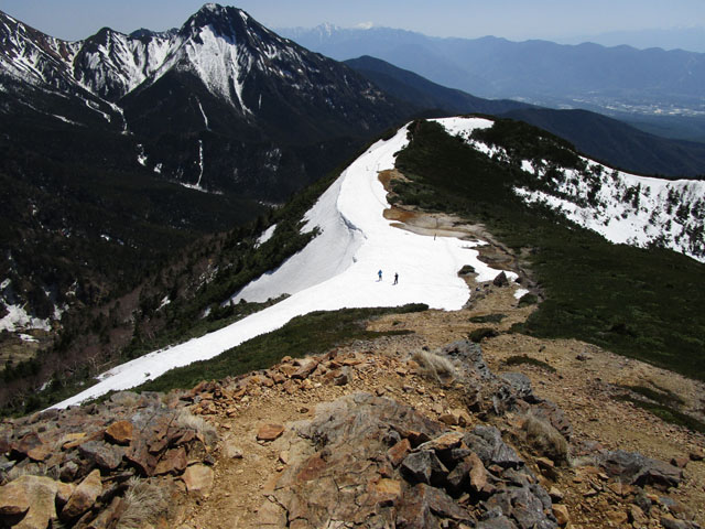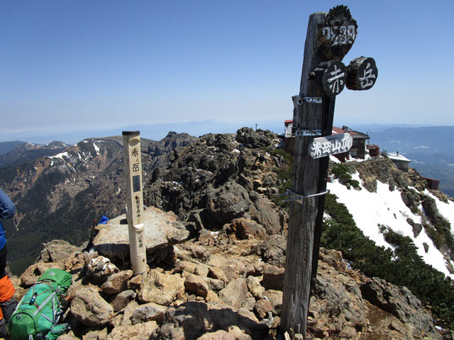 横岳も雪渓が残る。ここも落ちると死にそう。慎重に通過する。