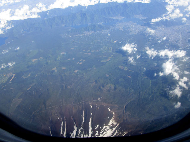 写真右下が富士宮口5合目で、つづら折の車道が見える。
