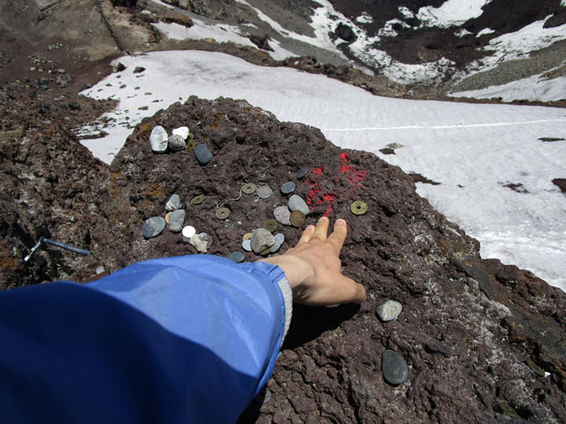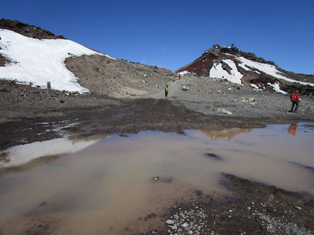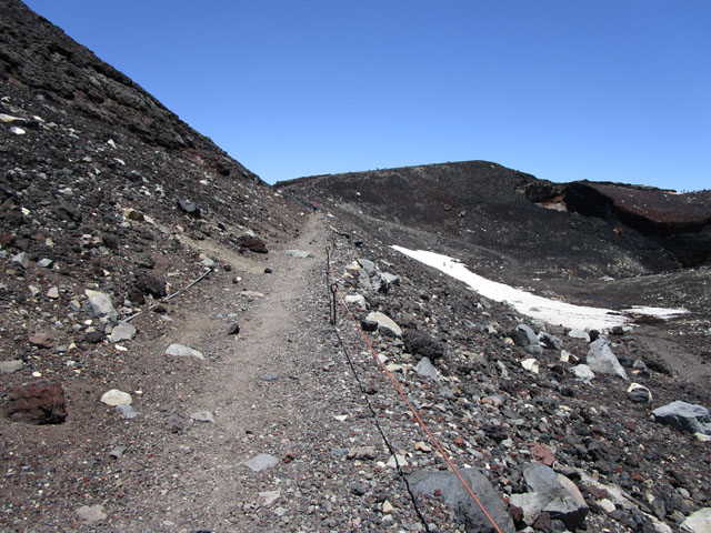 剣ヶ峰直下は雪が残っていて、滑り落ちると御釜に一直線だが、