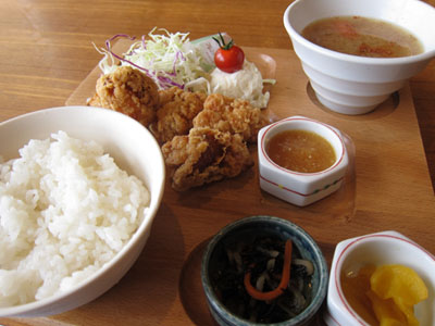 レストランで唐揚げ定食を食べてエネルギー+蛋白質を補給。