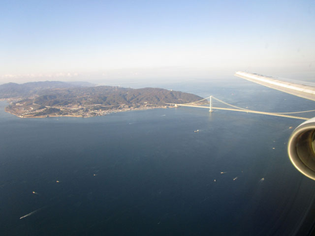 着陸時と同様に明石海峡大橋を超えるが、高度は倍の1800m程度。