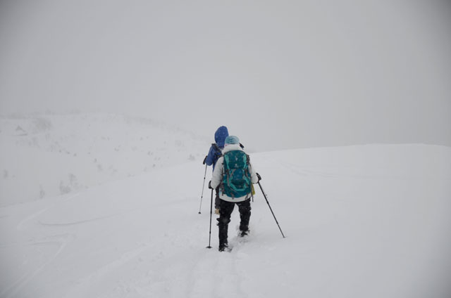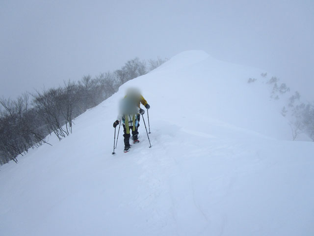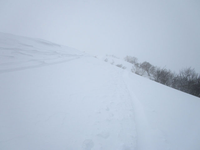 南に張り出す雪庇を、崩壊ラインを大きく回避してトレースをつける。