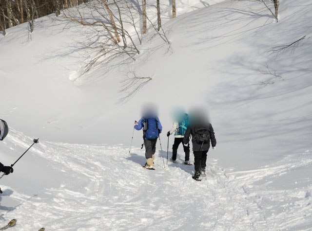 沢沿いは沢が埋まりきっておらず落っこちる恐れがある。