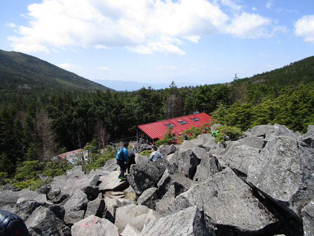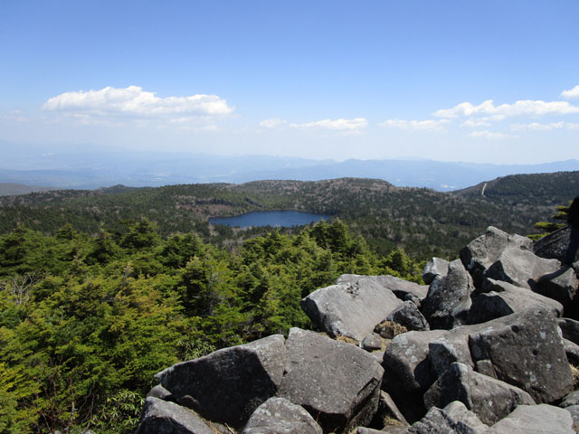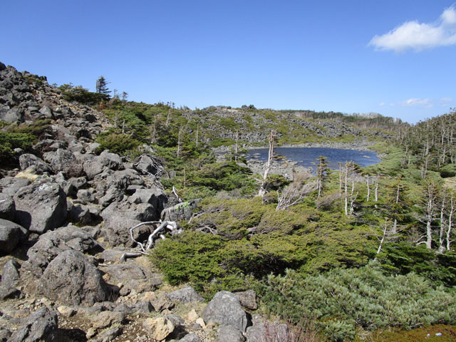 小屋の裏手にある岩山に登ると、さきほどの白駒池が見える。