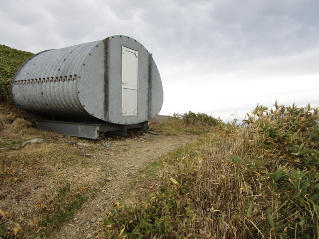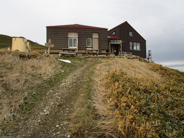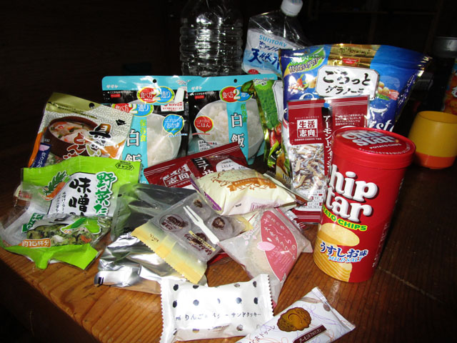 避難小屋宿泊前提に、寝袋・マット・テントも持参した。