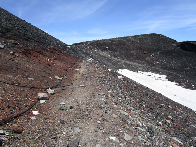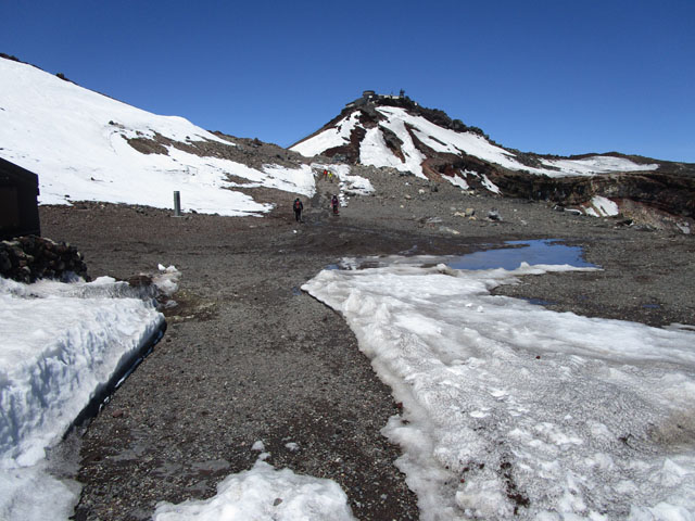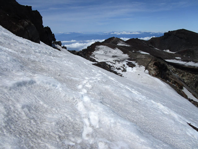 9.7合目付近に雪渓が残っていて、登りではアイゼン不要だが、