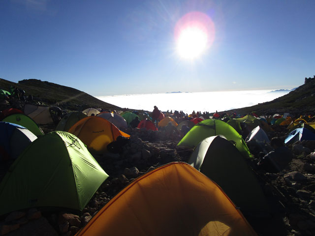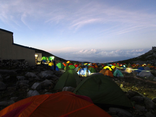 次に頂上山荘まで移動し、テントを設営する。