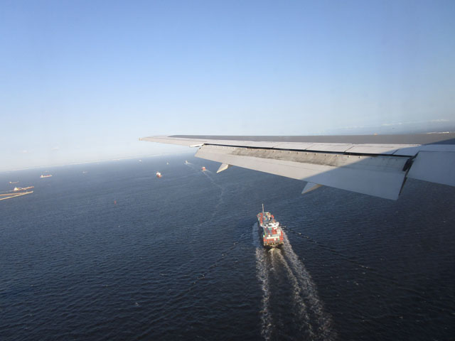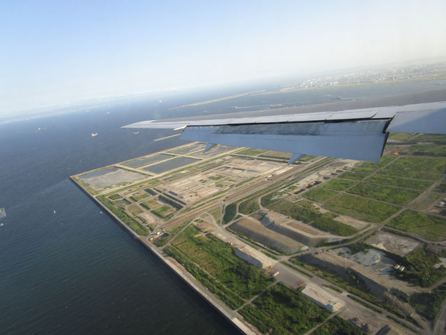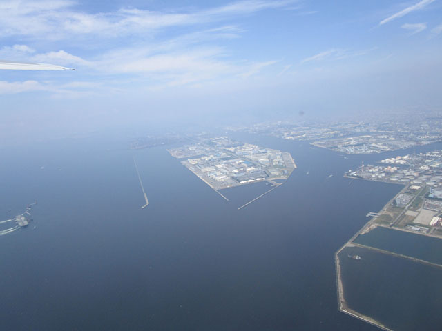 高度を下げ、お台場をかすめていく。