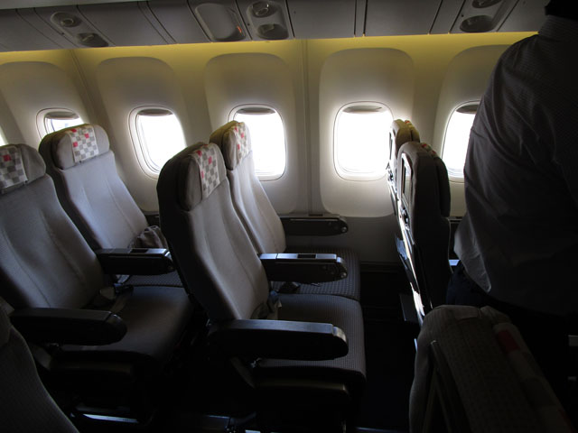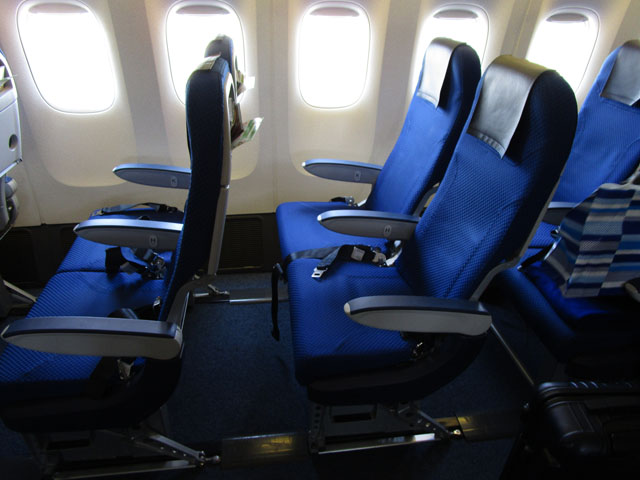 B777は横10列(3-4-3)だが、後方では横8列(2-4-2)になり快適だ。