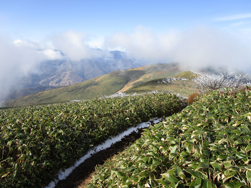 霧氷がついているが、地面に積雪はない。