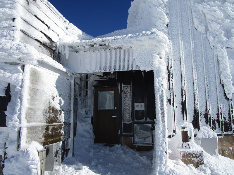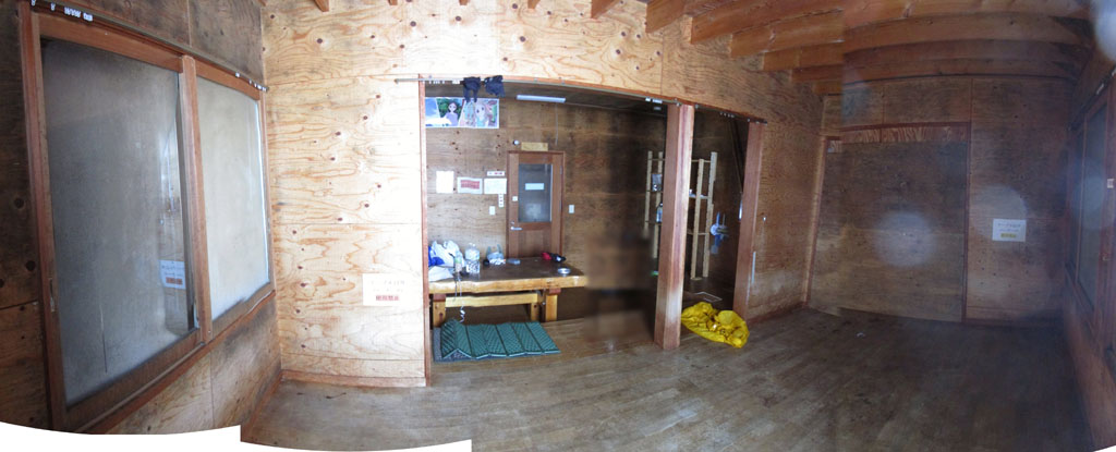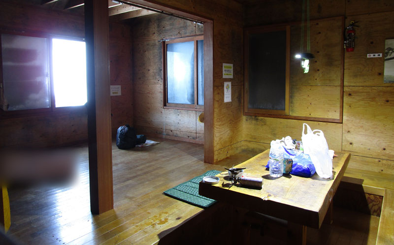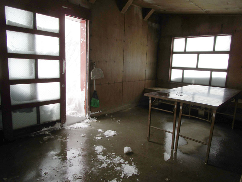 いったん小屋内に入って休憩し、この先の森林限界以上の暴風雪に備えて装備を整える。