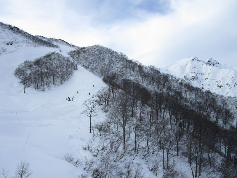 肩の広場ではスキーヤーが高速走行したシュプールがついている。