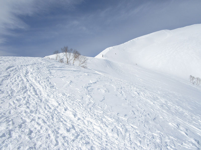 肩の広場ではスキーヤー等が滑った跡が残っている。