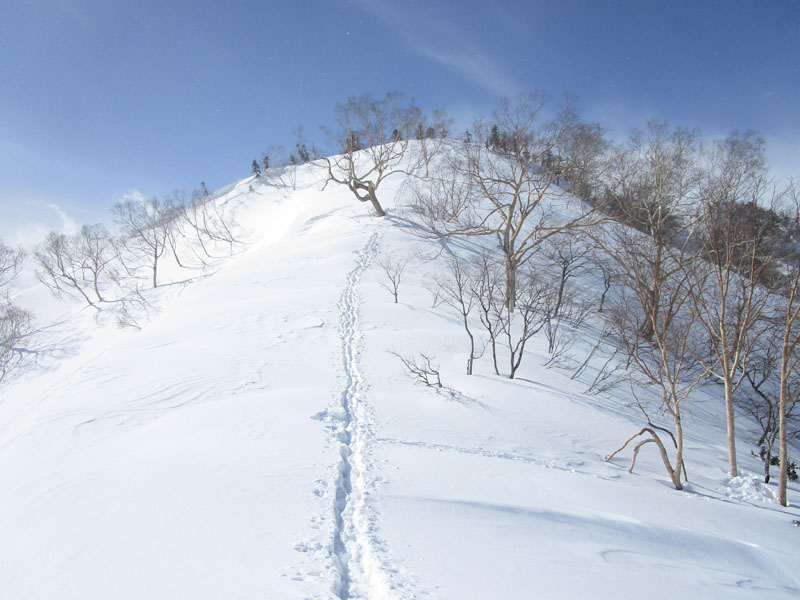 途中で滑走するBC屋が多いので、だんだんトレースは細くなるが、