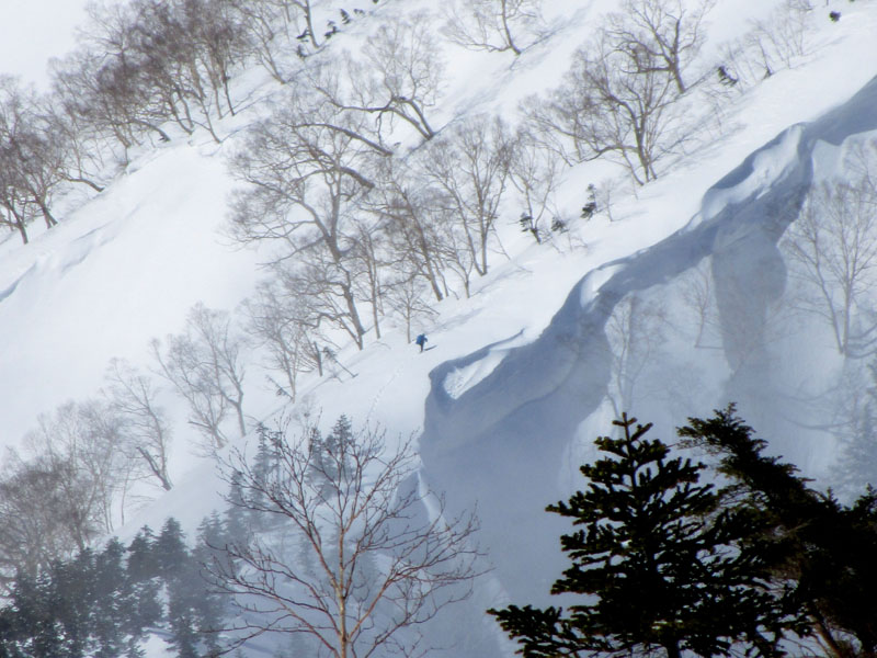 八方尾根から無名沢やガラガラ沢をBC滑走するルートである。