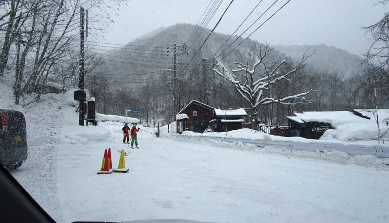 冬の白馬ならスキーで公道を移動するのができるのがすごい。