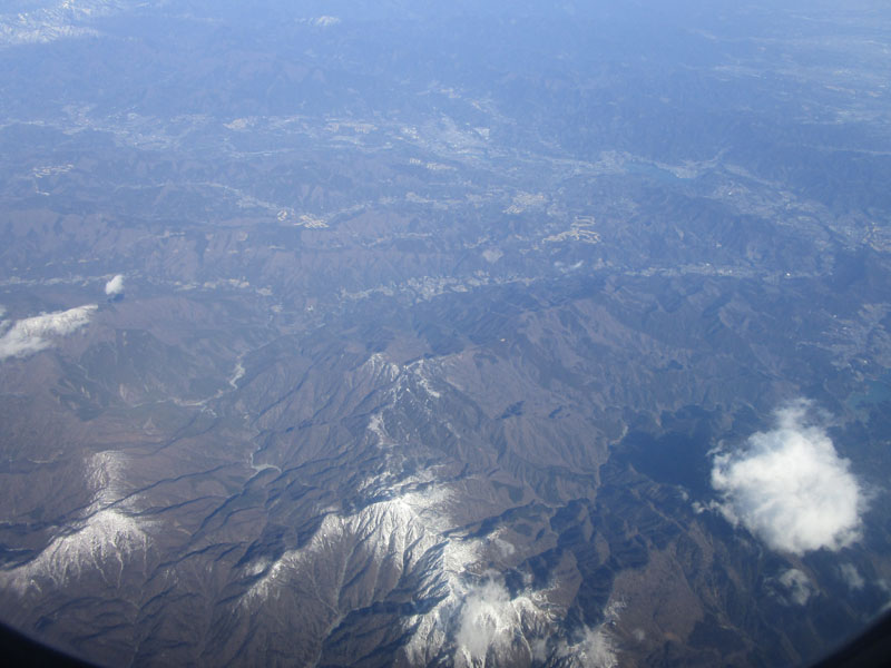 秩父山地が標高1500mくらい上から雪で白くなっている。