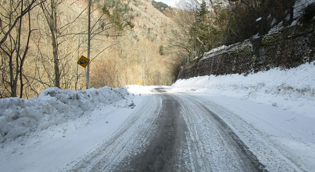 帰りも慎重に。下り13%勾配の道路がカリカリに凍結していて極めて危険。
