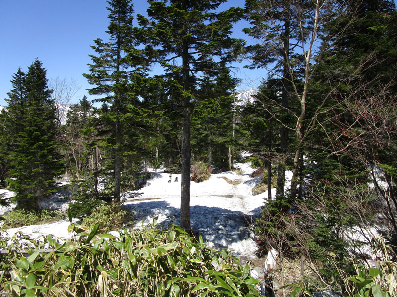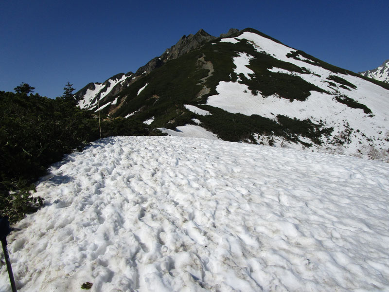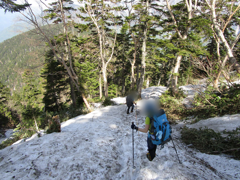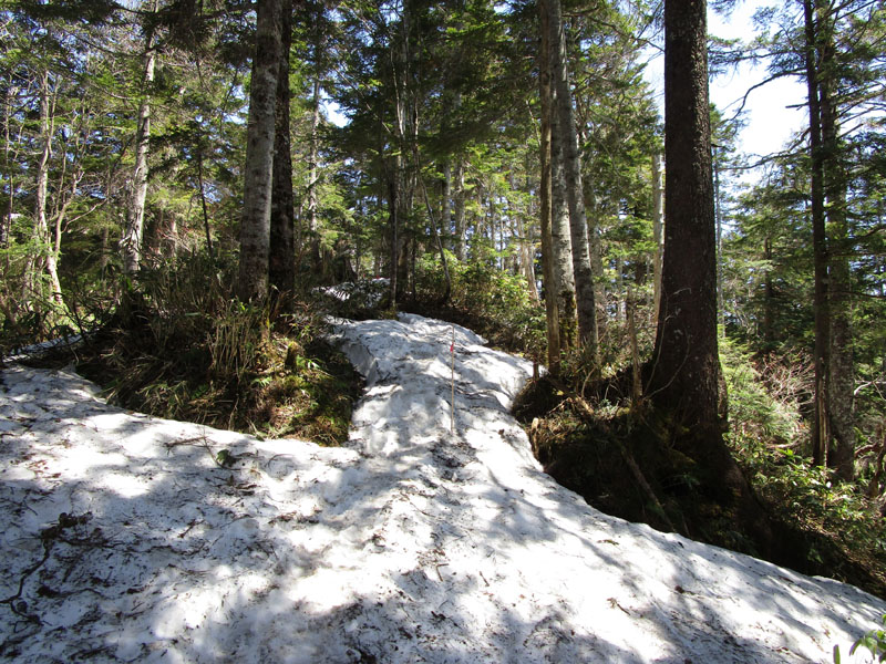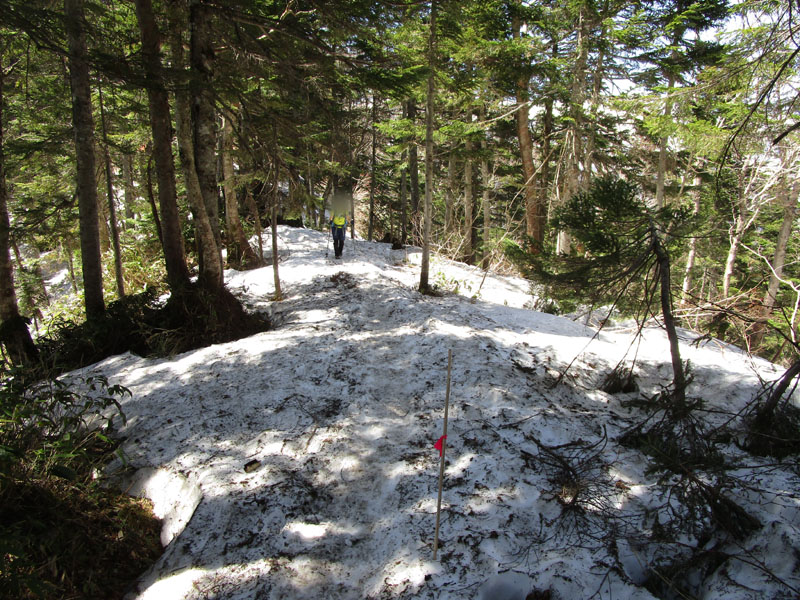 残雪があり慎重に。行きはアイゼンなし、帰りは軽アイゼン程度が必要だ。