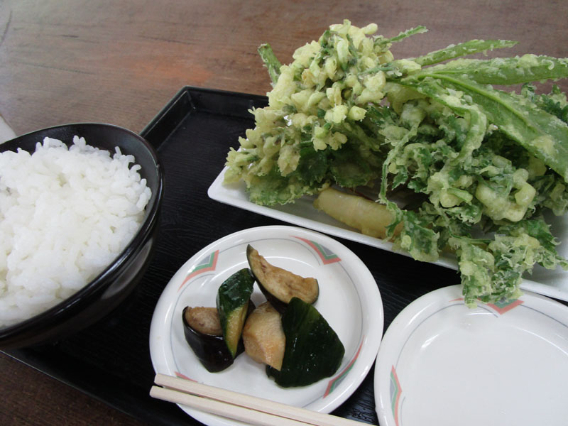 山菜天ぷら定食800円。天ぷらは塩分も少なくヘルシーなのでいい感じだな。