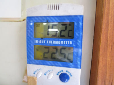 室内が22℃もあるのはストーブを焚いているため。