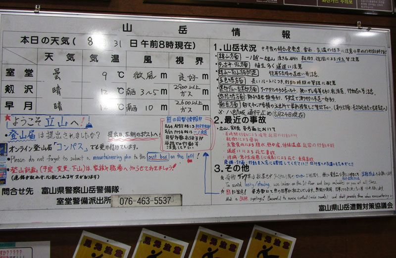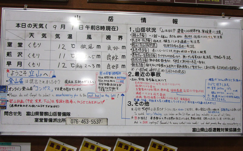 室堂ターミナルの情報掲示板。