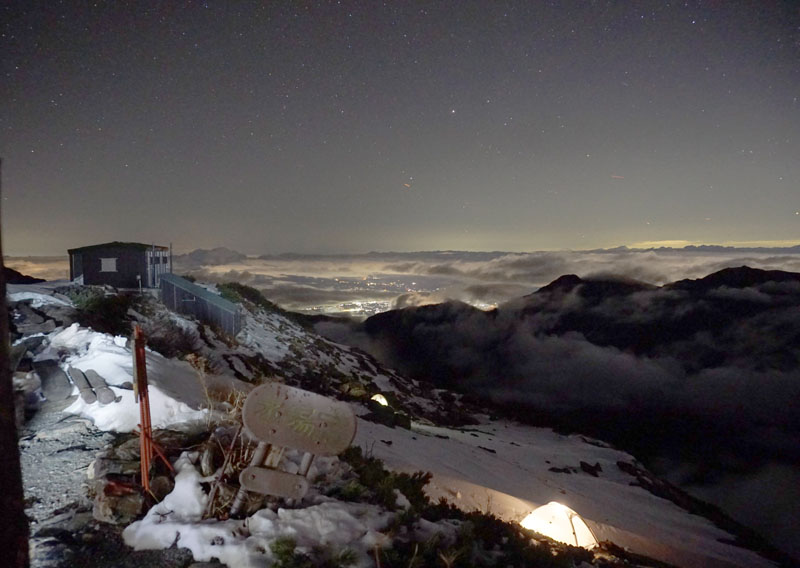 すっかり暗くなった。下界の夜景が見える。テントは2張り。すごい。