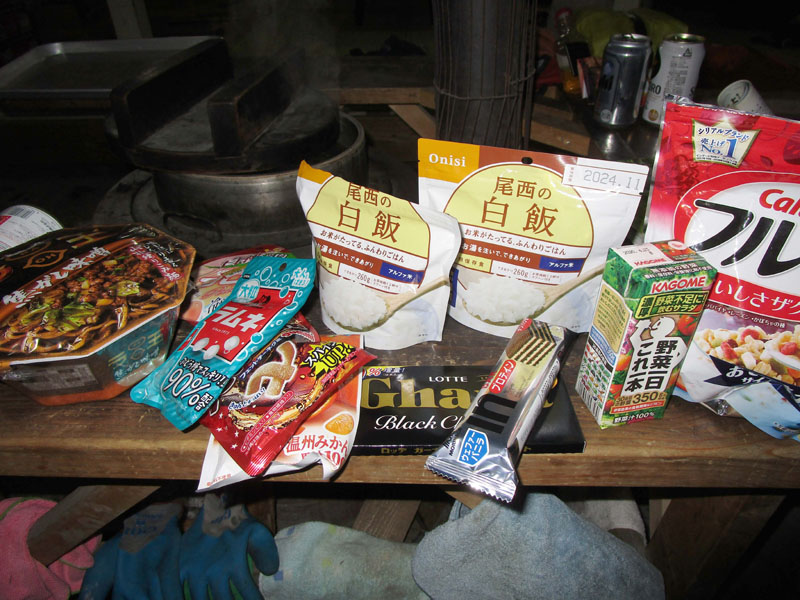 小屋に戻ってさっそく夕食にする。写真は今回搬入食糧。