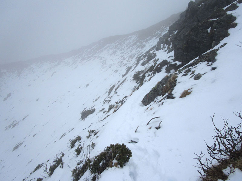 がけっぷちのトラバースなどもある。要注意。雪が硬く、特に朝晩は危険。